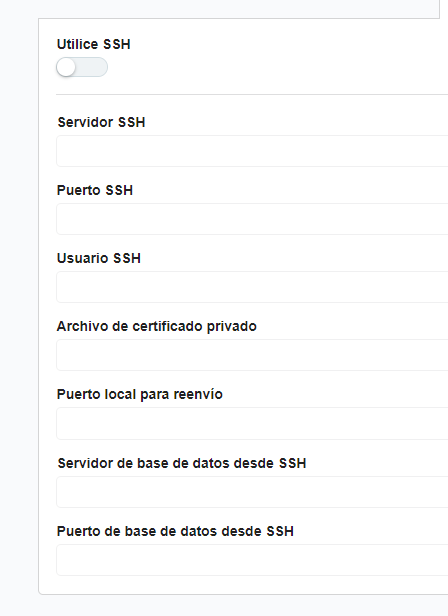 Habilita o deshabilita el túnel SSH para la conexión con la base de datos. Cuando está activado, la conexión a la base de datos se enruta a través del servidor SSH.