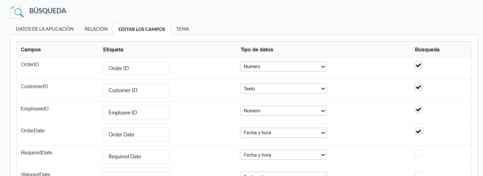 Esta pantalla muestra los campos de las tablas seleccionadas y permite realizar ajustes antes de la creación de la aplicación, como cambiar el tipo de dato y el nombre de visualización, entre otras configuraciones.