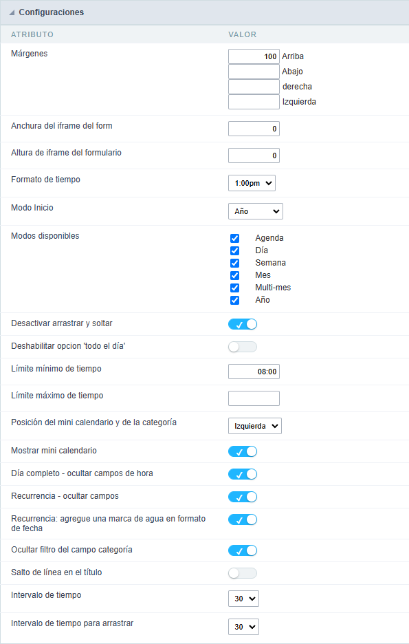 Si este atributo está desmarcado, los valores ingresados en los campos de hora serán ignorados al marcar el evento como “Todo el día”.