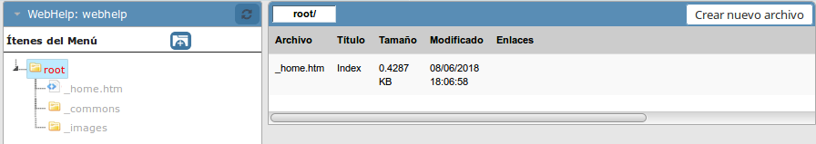 En el lado izquierdo, en el bloque ‘WebHelp’, veremos la estructura de la carpeta. Aún en este bloque, podemos crear las carpetas de la documentación.