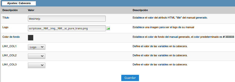 Defina una plantilla para usar en el encabezado del manual, es posible editar o crear nuevas plantillas en el editor.