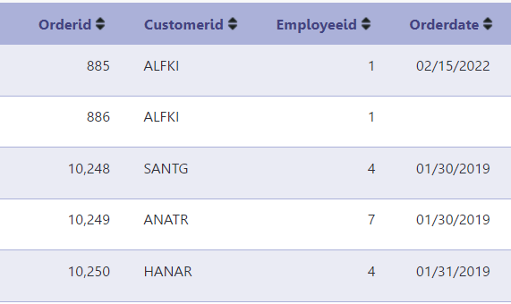 Exemplo dos ícones de ordenação do tema exibidos no mouseover