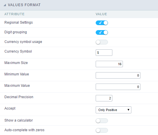 It allows applying the Regional Settings to format the dates of the field. When not enabled, it displays the attributes Grouping, Negative Symbol and negative number format.