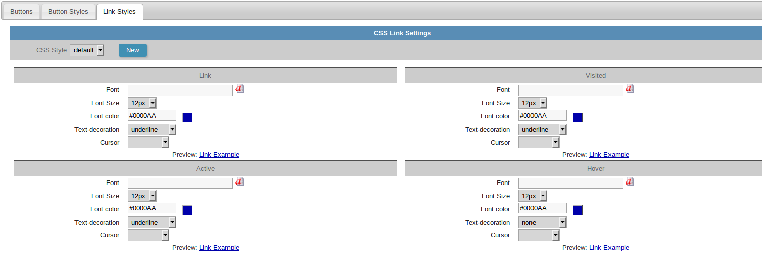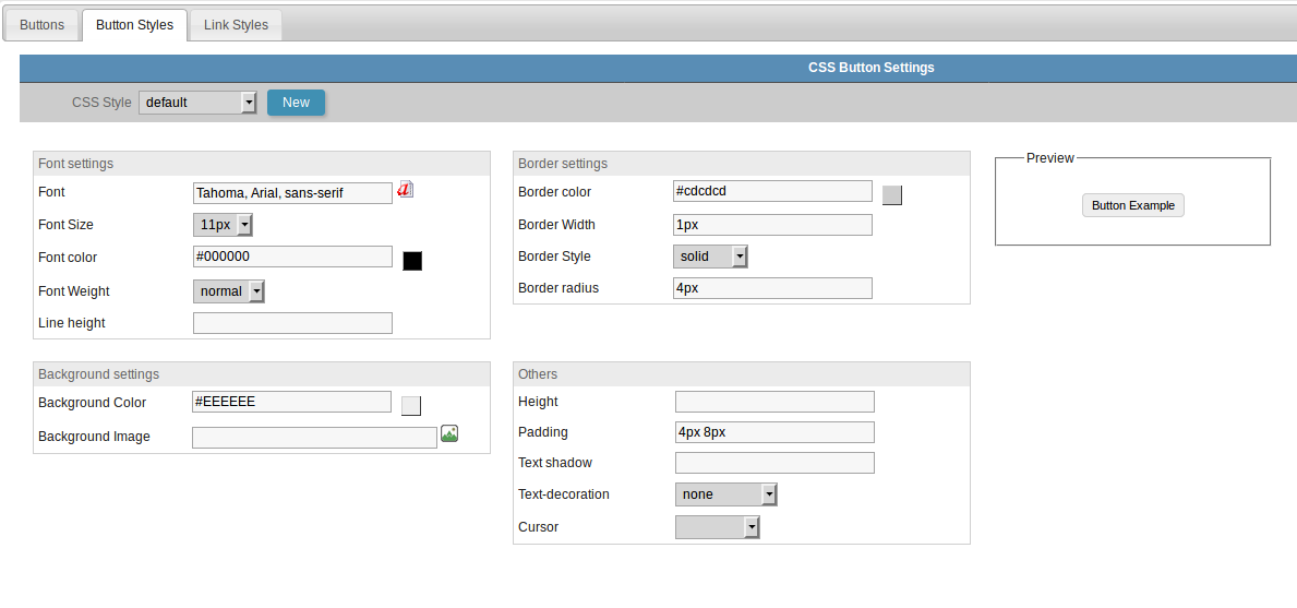 In this tab you can define the CSS style of the text buttons used in your outline. All schemes already have a default style that can not be deleted. If your layout requires more than one type of layout for the text buttons, just click on the “new” button and set up a new style. Go back to the Buttons tab and select the created style.