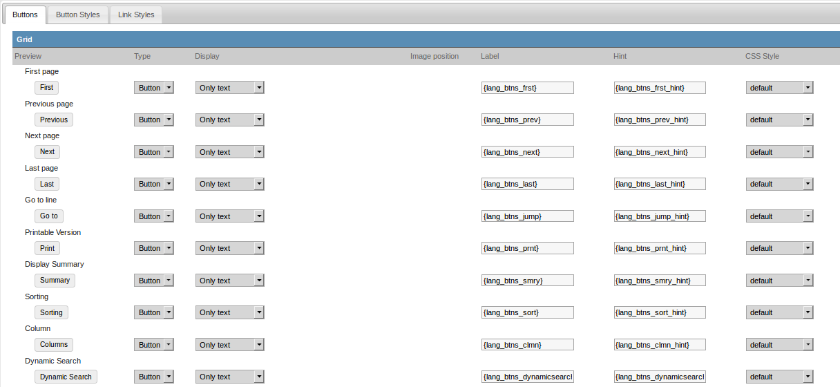 In the first tab (Buttons) the buttons used in Scriptcase are displayed. Each button can have a different characteristic, being possible to choose between image, text button or link. If you use the image type button, a field will be displayed to upload the image. For text and link button types use the tabs: Button Style and Link Styles to edit their appearances.