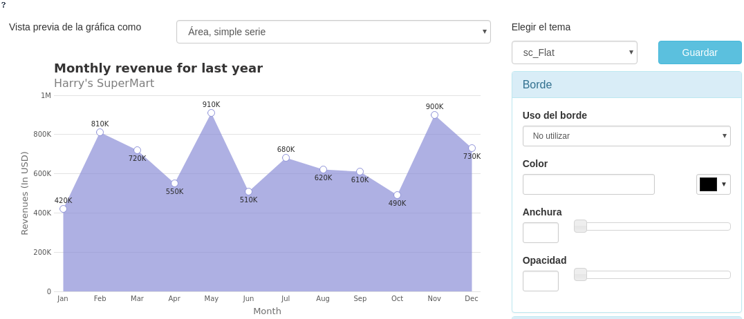 En esta área puede personalizar los temas del gráfico, podrá obtener una vista previa de cómo se verá de acuerdo con cada tipo de gráfico.