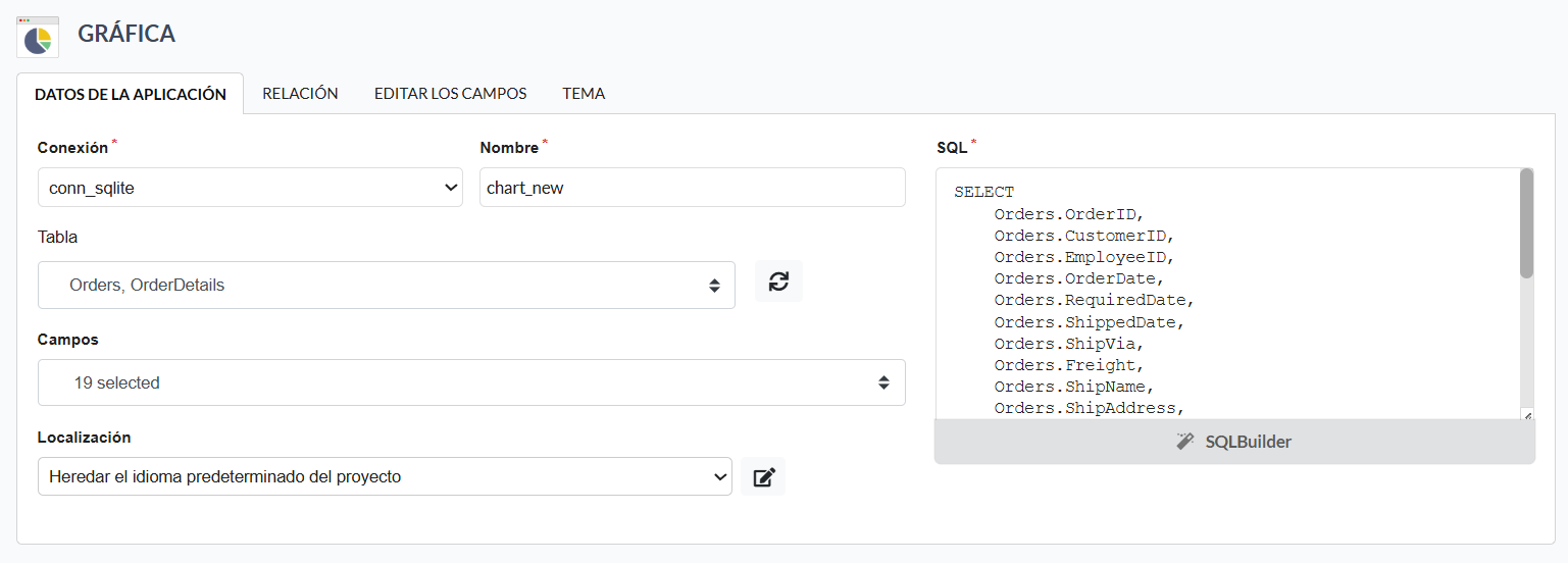 En esta pestaña usted debe seleccionar la conexión que se utilizará en la aplicación. Al seleccionar la conexión las tablas se cargarán y se mostrarán en el campo Tabla.