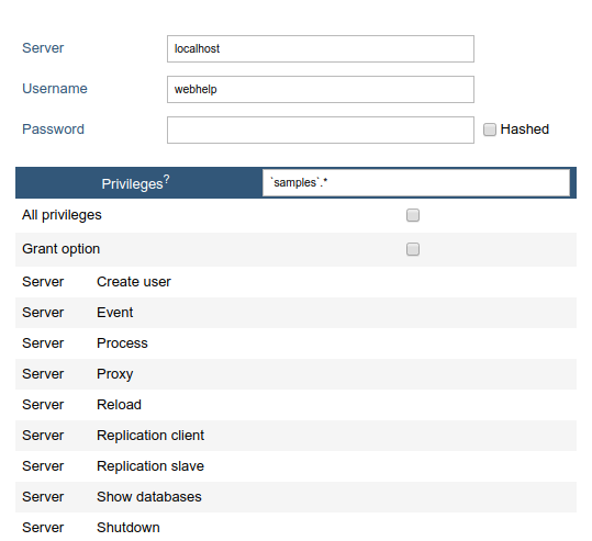 The options and settings on the Database Builder depends of the user database privileges and the used database.