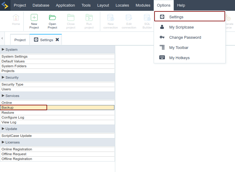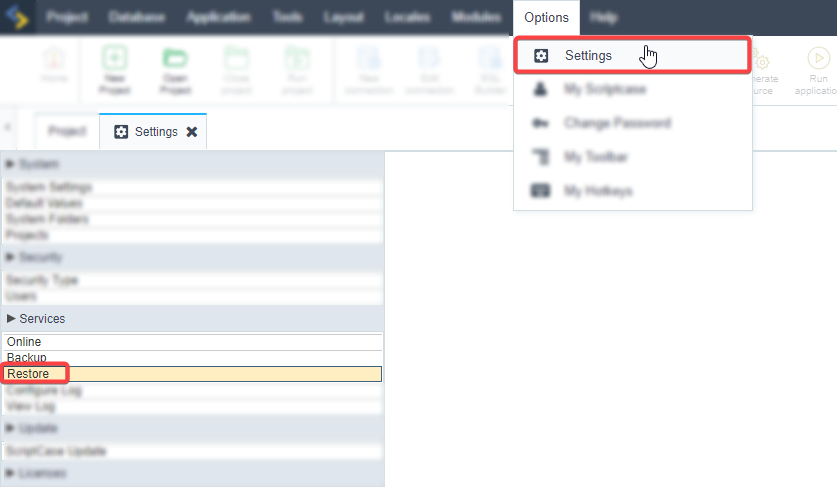 In Scriptcase with PHP 8.2, restore the backup made in #Step 1, accessing the menu: Settings > Services > Restore.